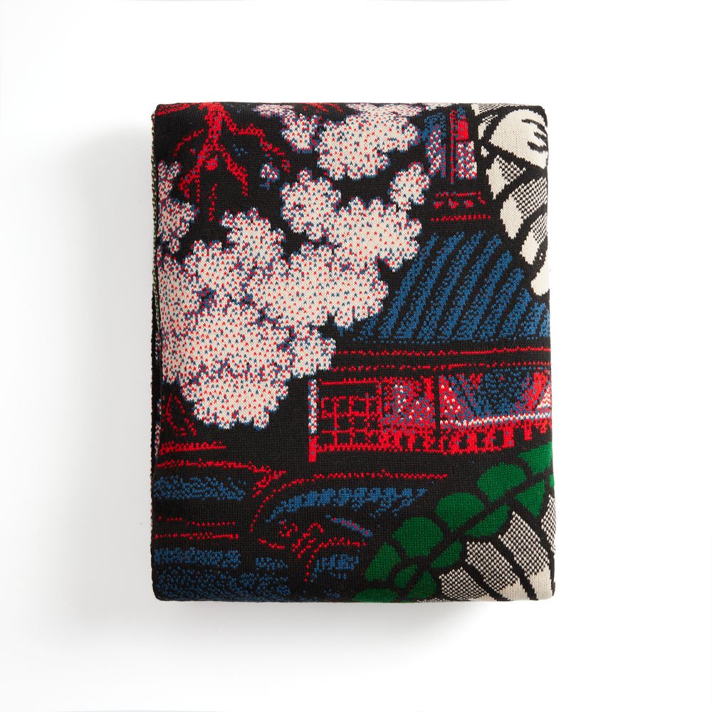 Плед с вывязанным логотипом и индивидуальным рисунком в фирменной цветовой гамме. Выполняется на машине 12 класса с увеличенным количеством нитеводителей и уменьшенным размером иглы, что позволяет делать более мелкую петлю и использовать в вязании до 8 цветов пряжи в одном ряду для создания плавных градиентов. Теперь любой плед можно превратить в настоящую картину и изобразить на ней все, что захочется, с почти фотографической точностью.