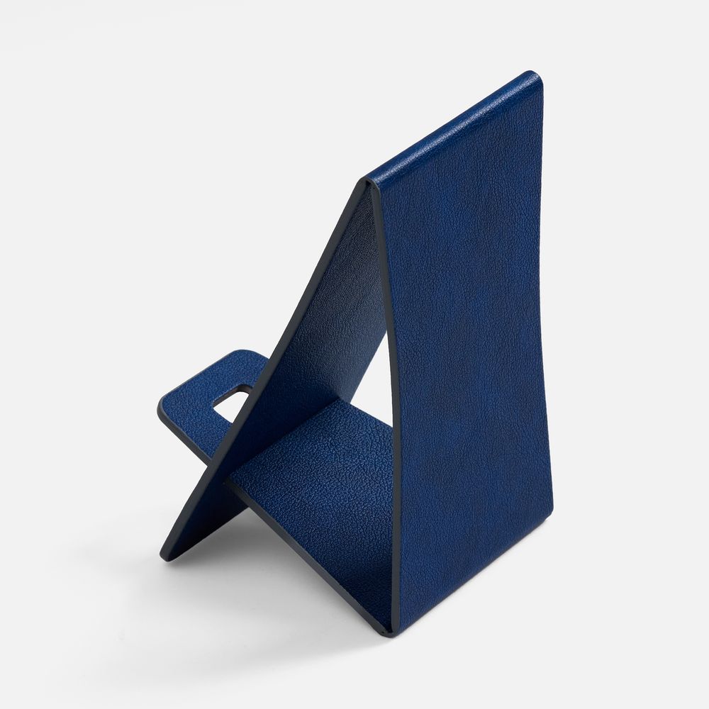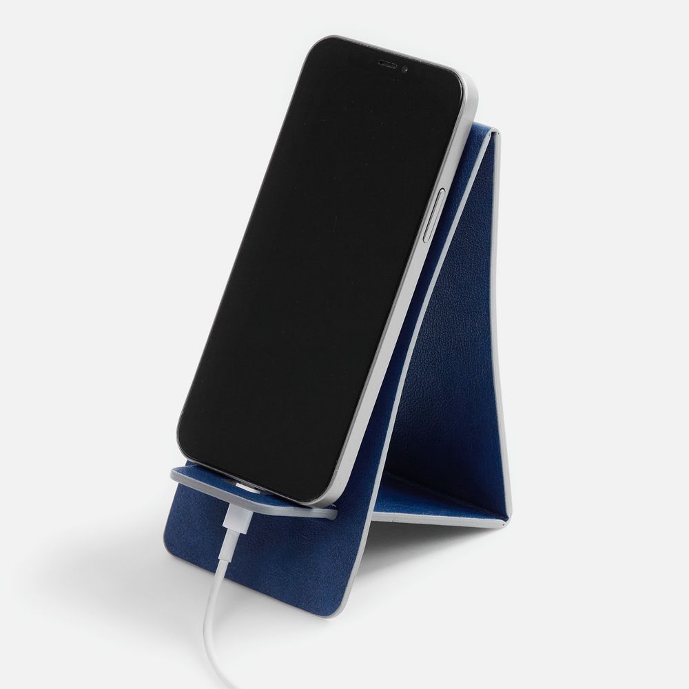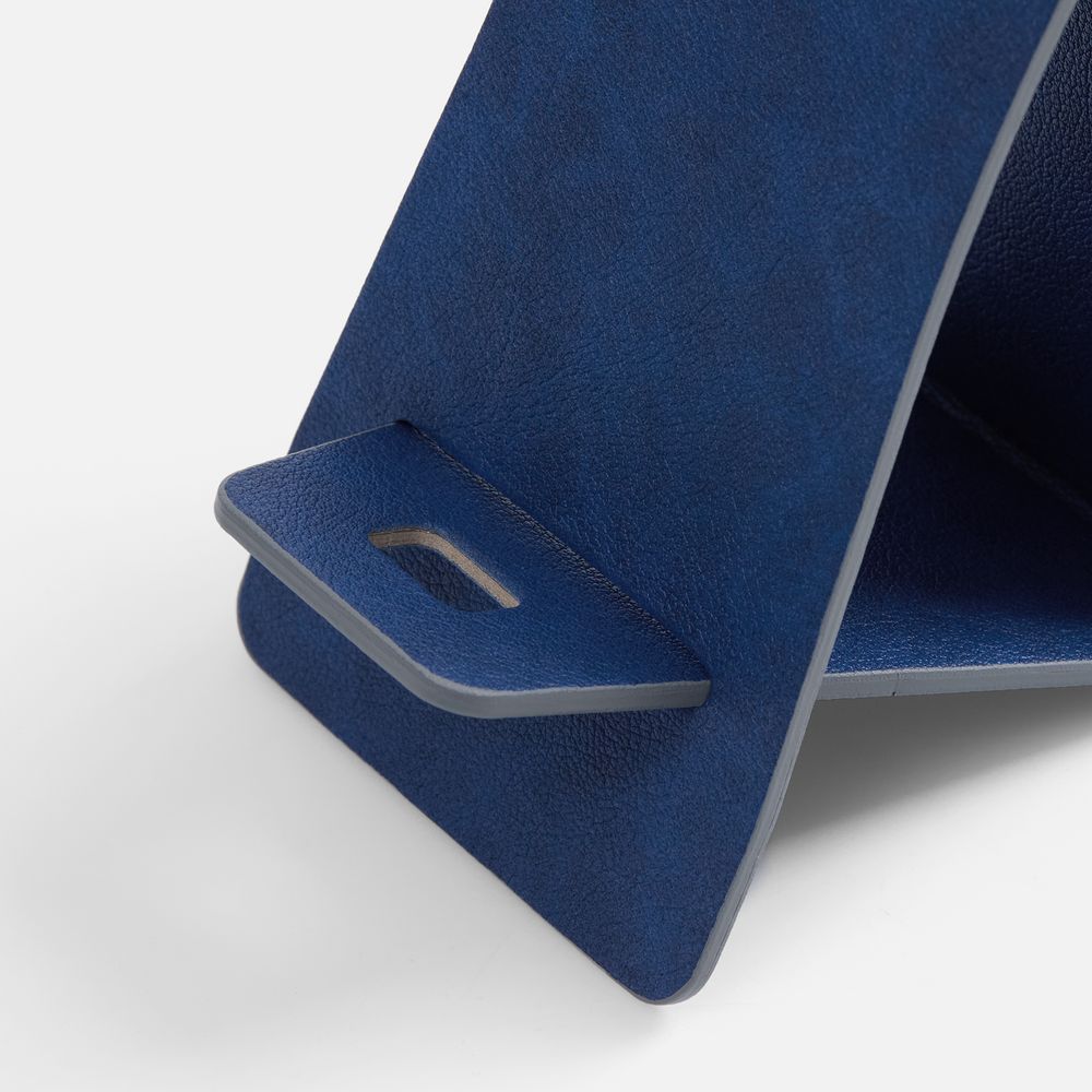 Складная подставка для телефона с вырубкой под шнур зарядного устройства. Выполнена из материала Petrus.