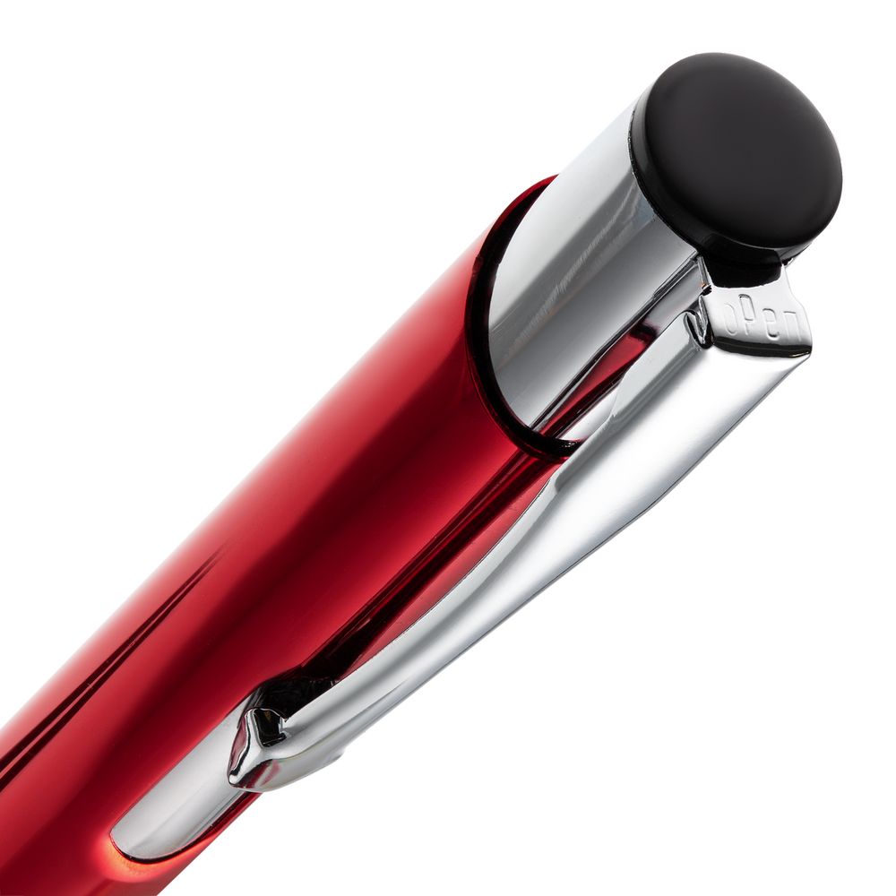 Яркая шариковая ручка с глянцевым цветным корпусом и хромированными деталями.