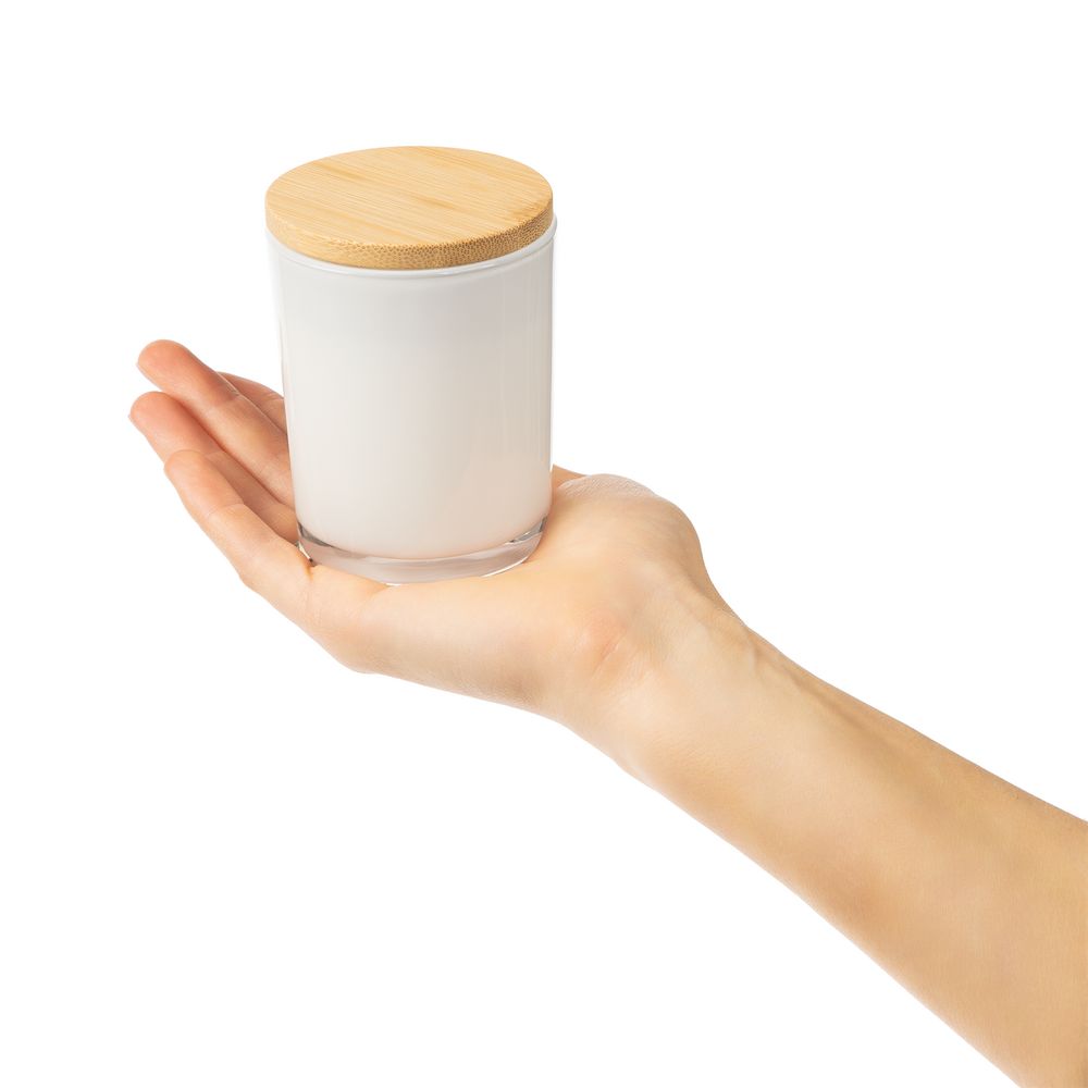 свеча — воск, кокосовый, парафин; подсвечник — стекло; крышка — дерево; фитиль — дерево