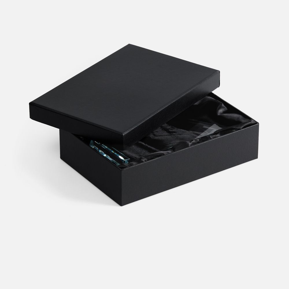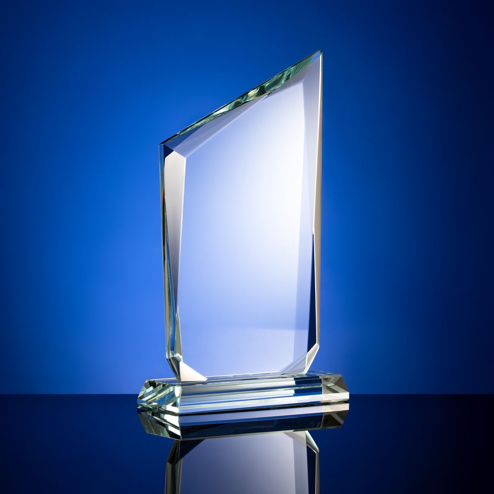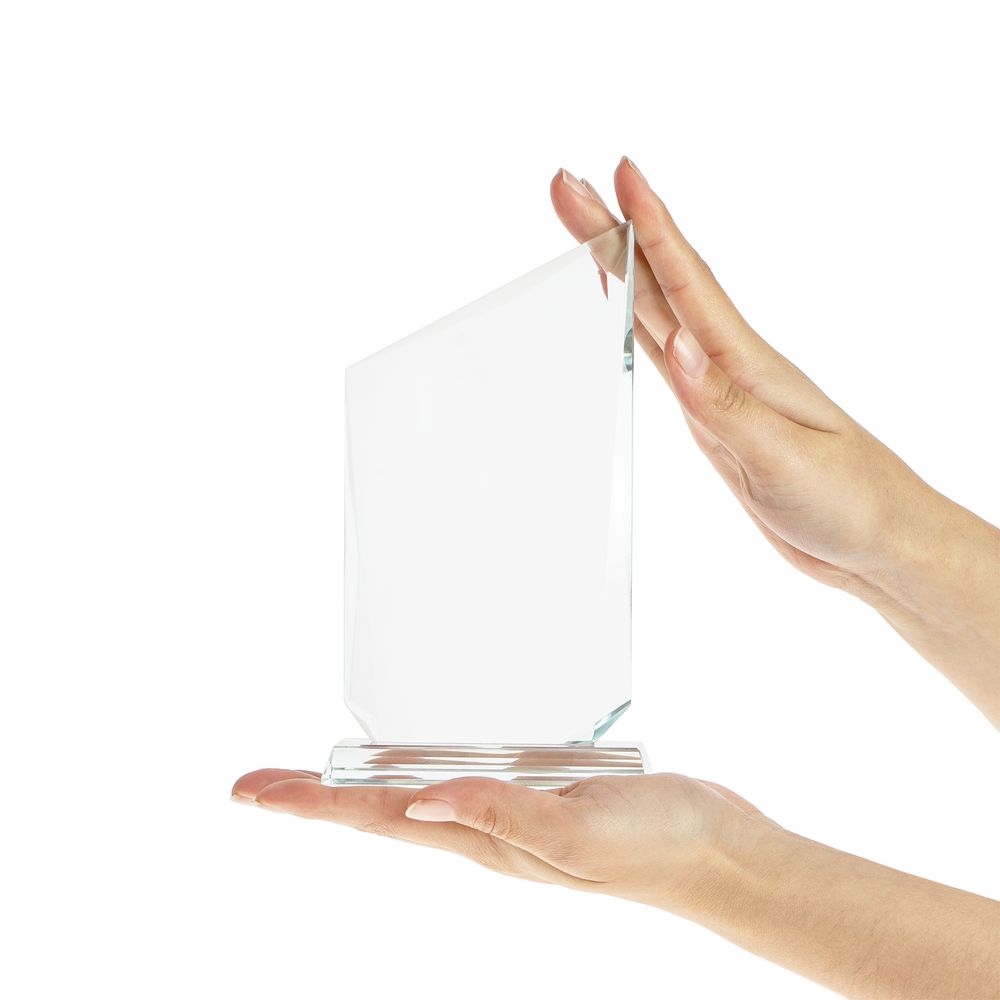 Стела изготовлена из стекла К9, в основе которого лежит оптическое боросиликатное стекло. Эту марку стекла отличает низкий процент посторонних включений, высокий показатель преломления и высокая прозрачность — идеальные качества для изготовления наград премиального уровня.