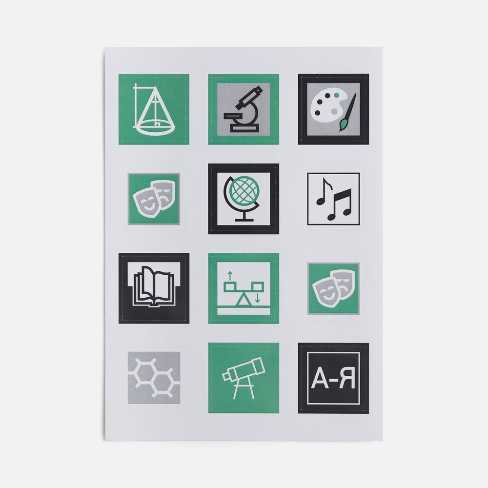 В каждой части общего рисунка изображены главные символы, связанные с наукой и искусством.
