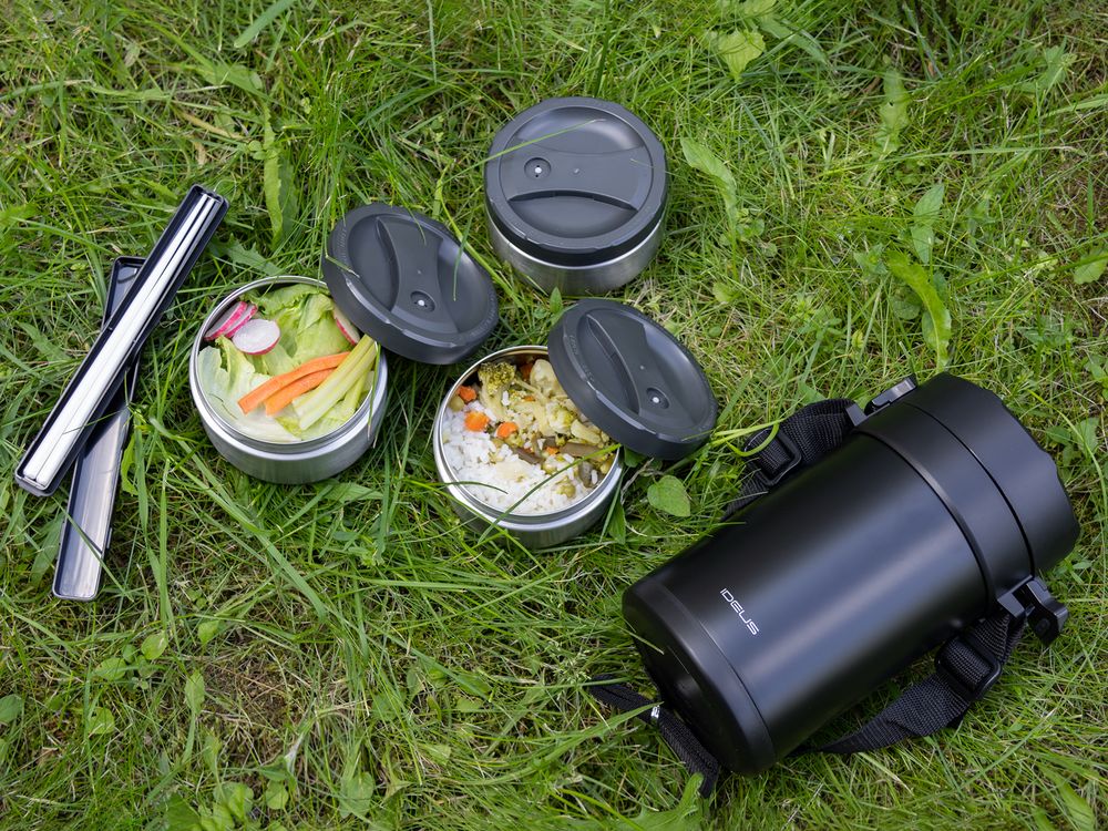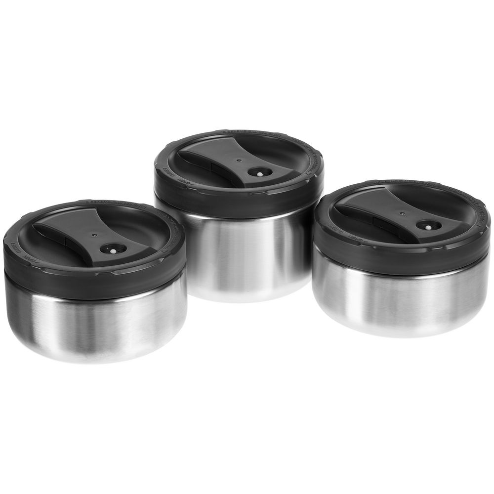 - Внутри термоса: три контейнера из стали с крышками из пластика: один 730 мл и два по 550 мл