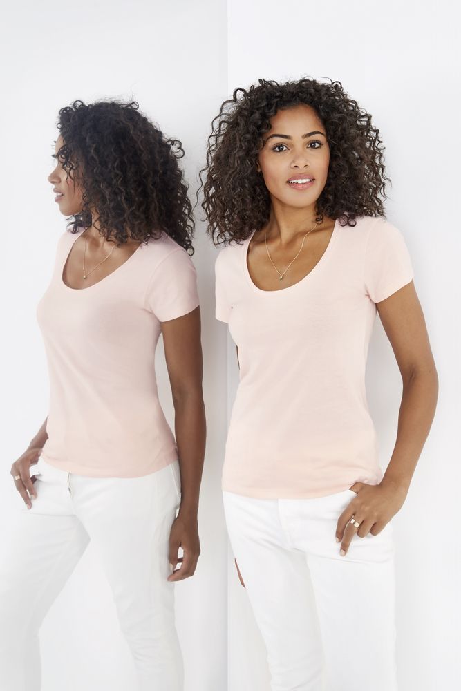 Женственная футболка с глубоким круглым вырезом.