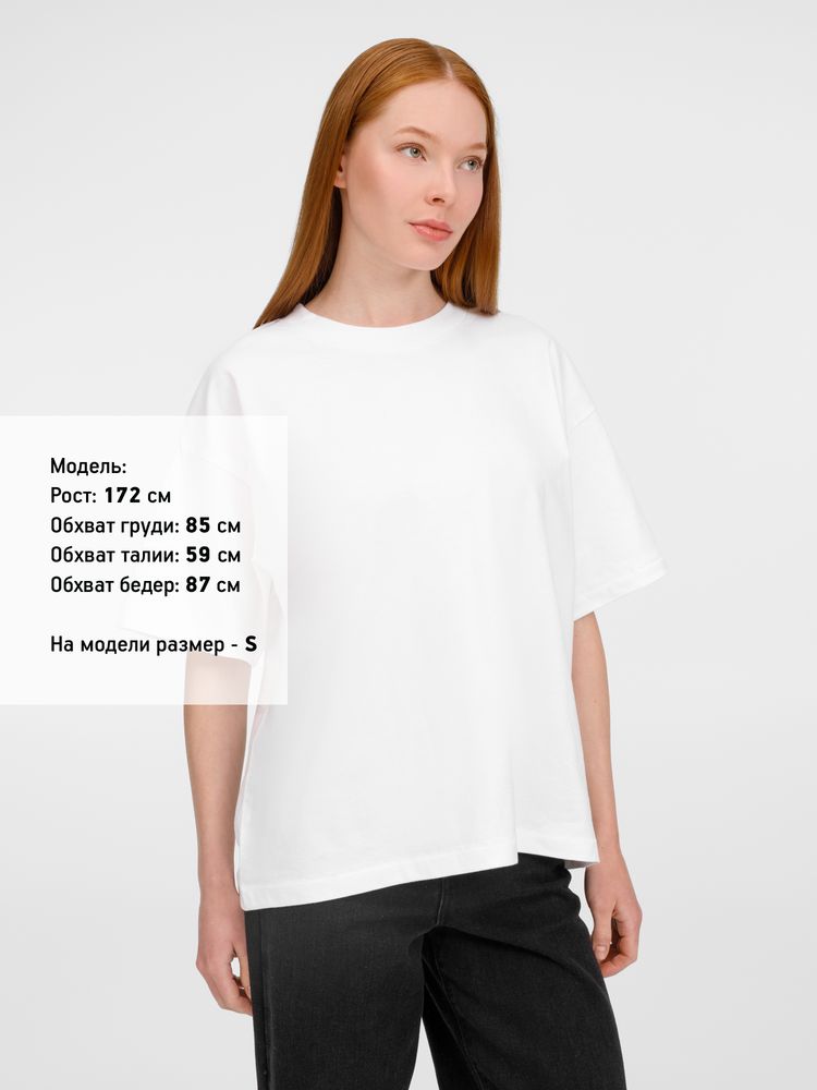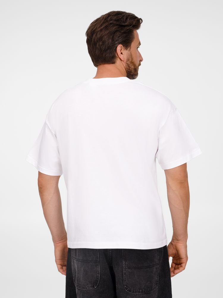 Футболка оверсайз унисекс с круглым вырезом и без боковых швов. Выполнена из смеси переработанного и обычного хлопка. Благодаря повышенной плотности отлично держит форму.