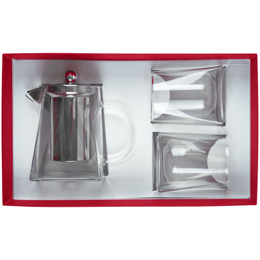 чайник, стаканы — боросиликатное стекло; крышка и сито — нержавеющая сталь; коробка — переплетный картон, бумага Classy Covers