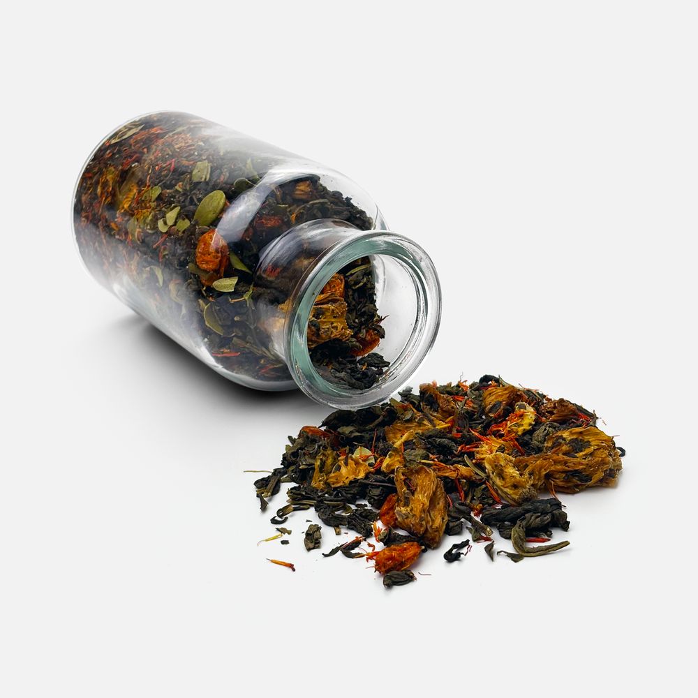 Состав: чай зеленый с ананасом и соком ананаса (чай зеленый байховый крупнолистовой, кусочки ананаса, сок ананаса), цветки сафлора, толокнянка, облепиха сублимированная, ароматизатор натуральный Персик, ароматизатор натуральный Груша.