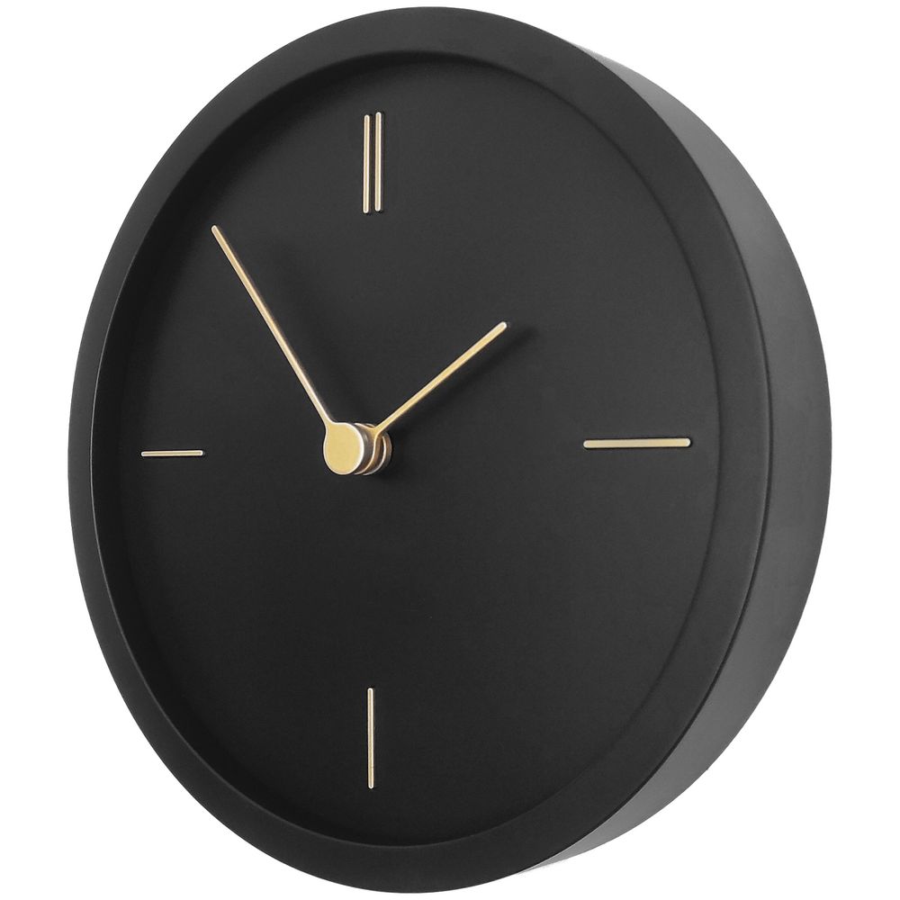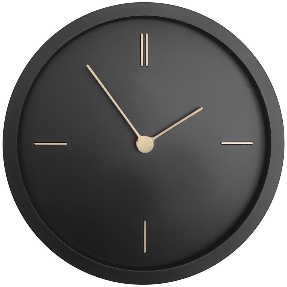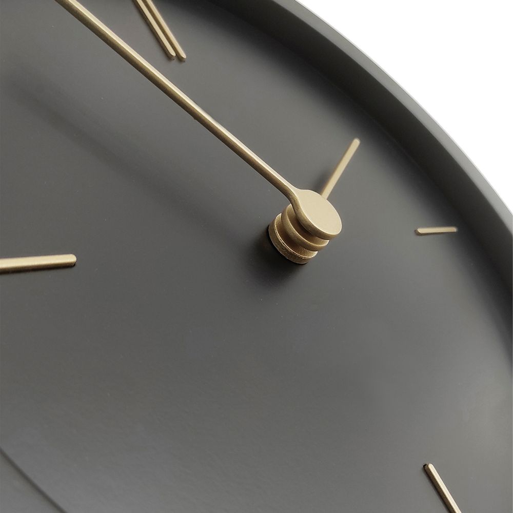 На круглом черном корпусе настенных часов Thelma выигрышно выделяются контрастные золотистые стрелки и тонкие линии часовых меток, создавая строгий и элегантный дизайн.