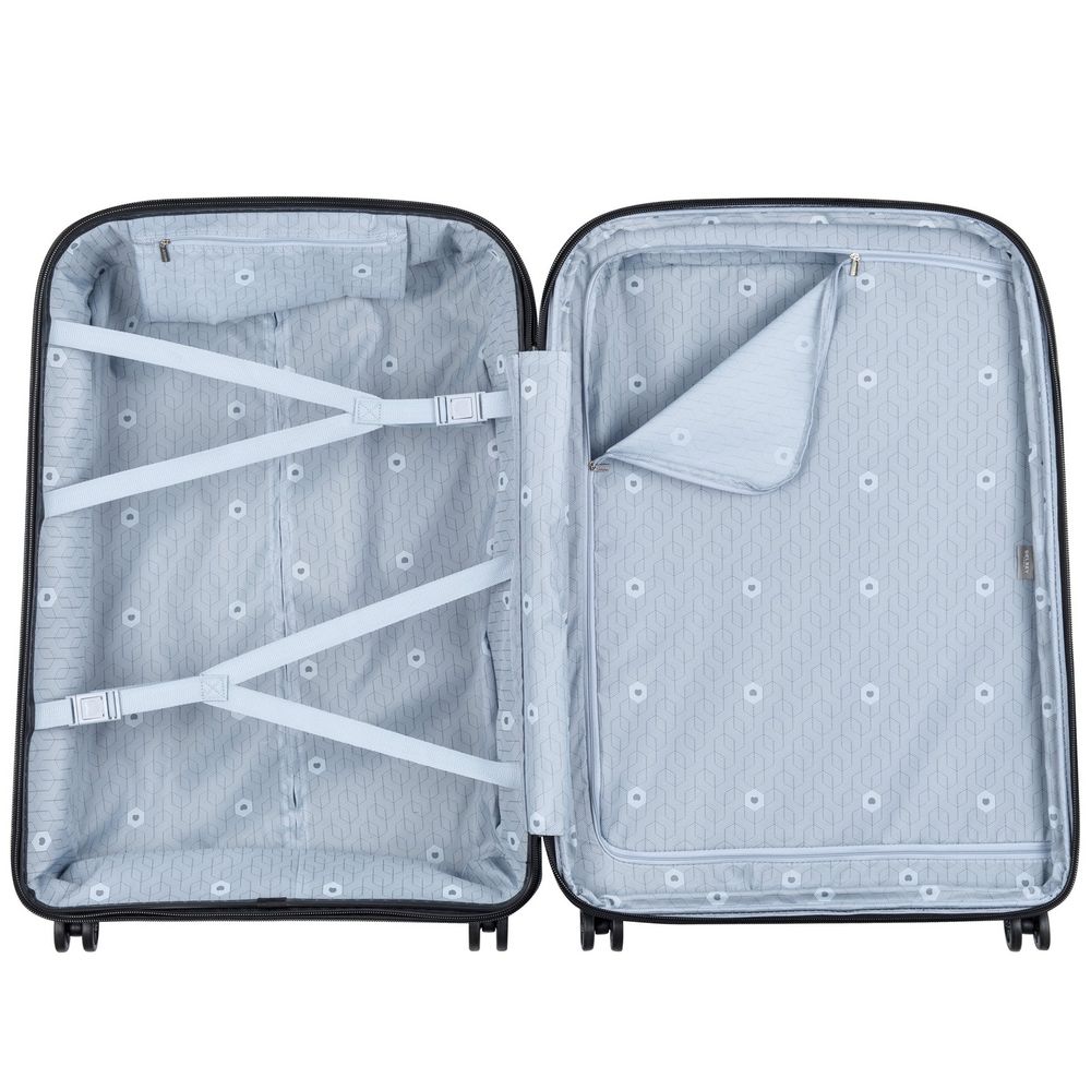 - Чемодан с 2 отделениями: одно из них с фиксирующими ремнями и карманом-органайзером на молнии, второе — с разделителем