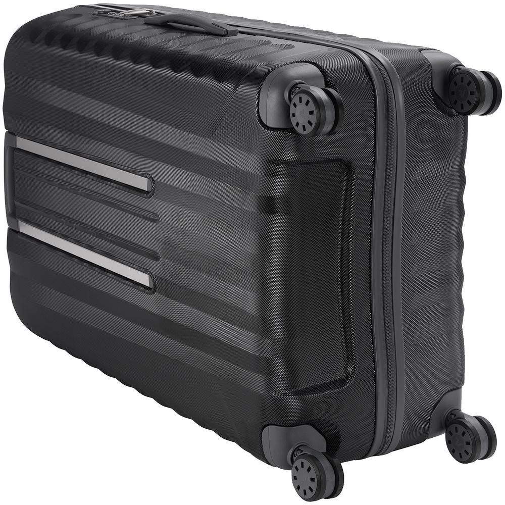 Корпус изготовлен из ударостойкого поликарбоната с покрытием, имитирующим алмазные грани, — такая технология препятствует появлению царапин и делает чемодан еще более прочным и выносливым.