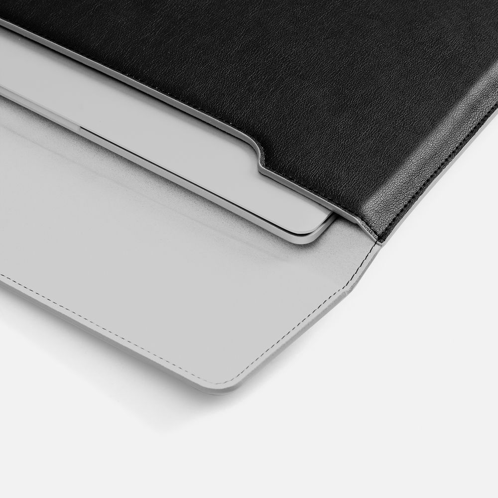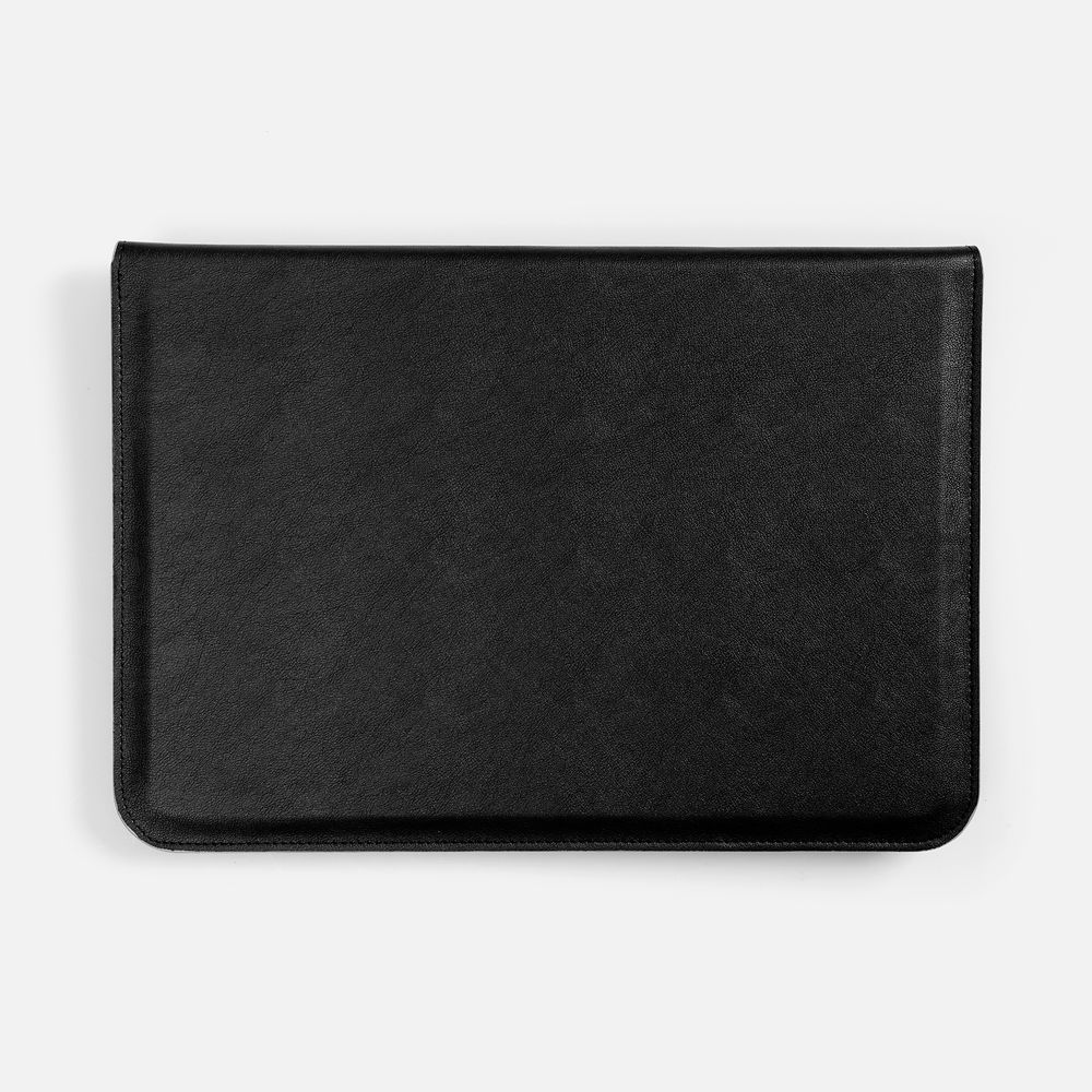 Чехол для ноутбука с диагональю до 15,6 выполнен из материала Petrus, черного цвета, дополнен окрашенным срезом края серого цвета.