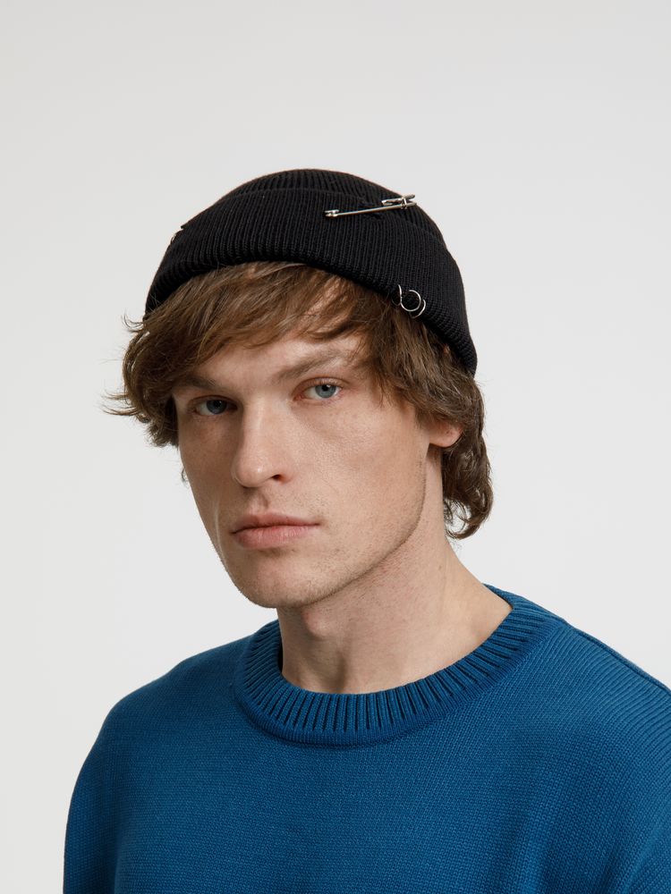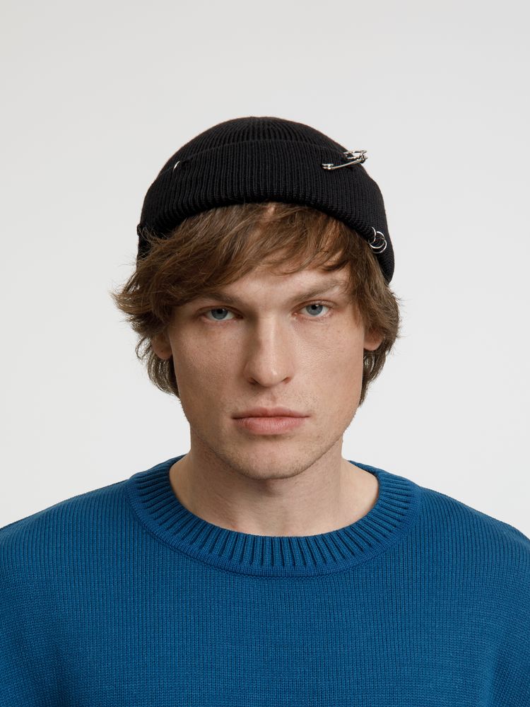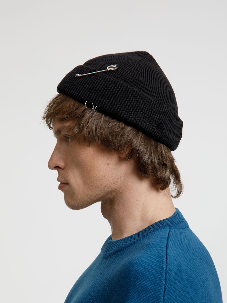Однослойная шапка бини с рваным отворотом и металлическими аксессуарами для дерзких образов в любом возрасте. Яркий и запоминающийся акцент в стиле гранж.