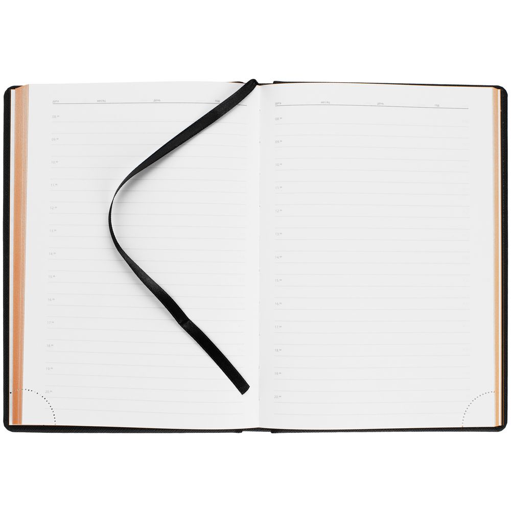 Твердая обложка выполнена из материалов Nice Touch, черный АА, и Canyon, оранжевый ОО. Ежедневник дополнен капталом, резинкой для ручки и ляссе черного цвета.