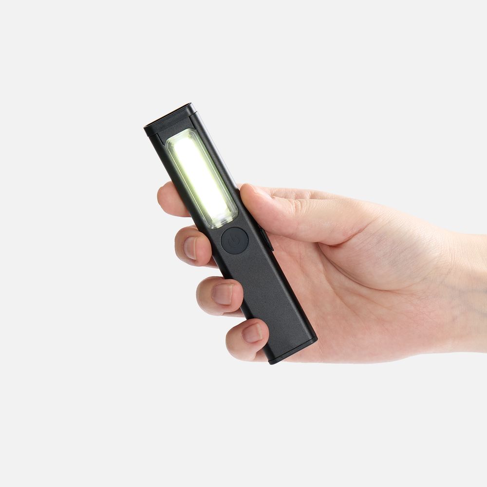 Плавная регулировка яркости осуществляется удержанием центральной кнопки при включенном устройстве — это позволяет точно адаптировать освещение под рабочие условия. Магнит в основании фонарика дает возможность зафиксировать фонарик на металлической поверхности и освободить руки для выполнения задач.