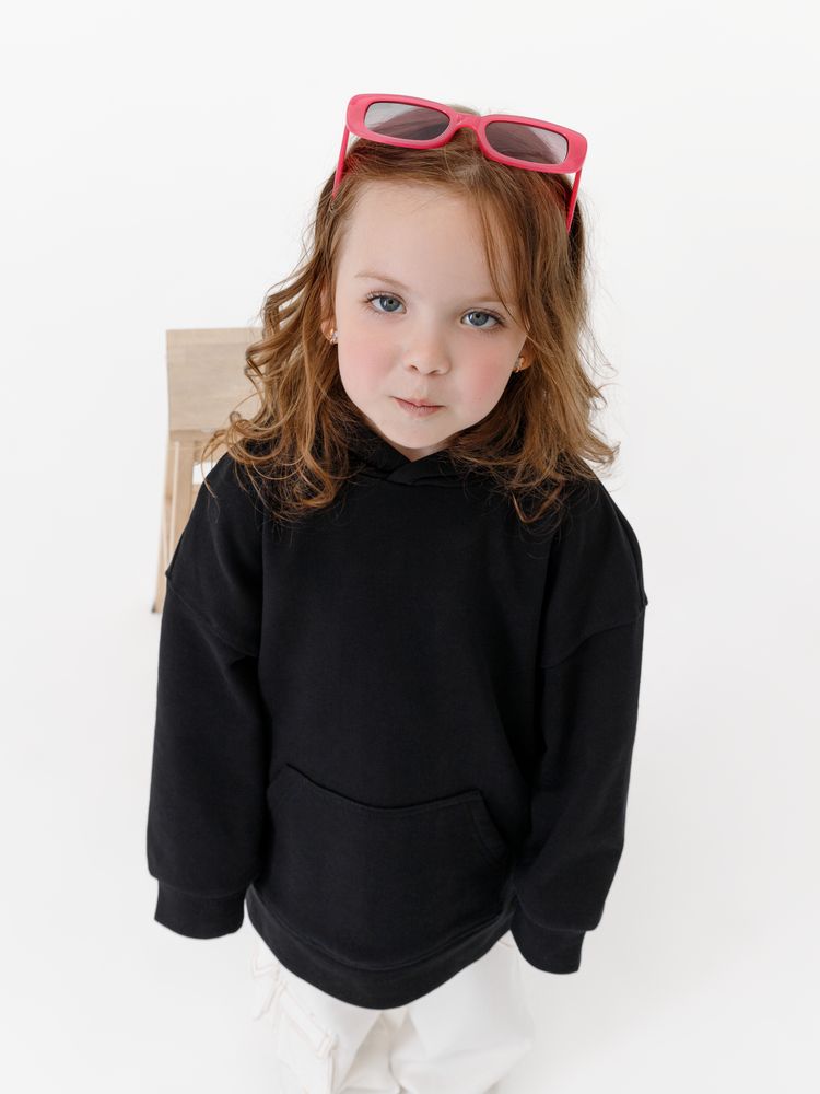Детское худи оверсайз со спущенным плечом и карманом-кенгуру.