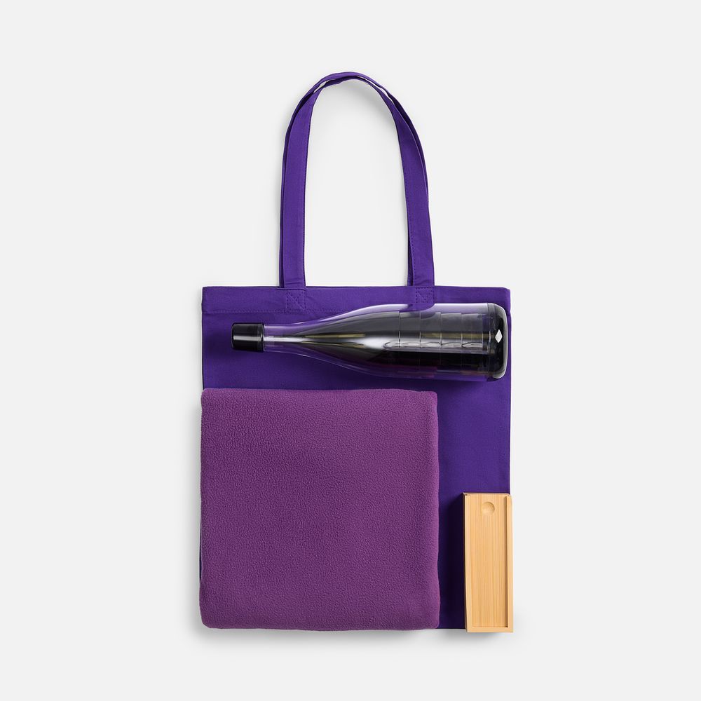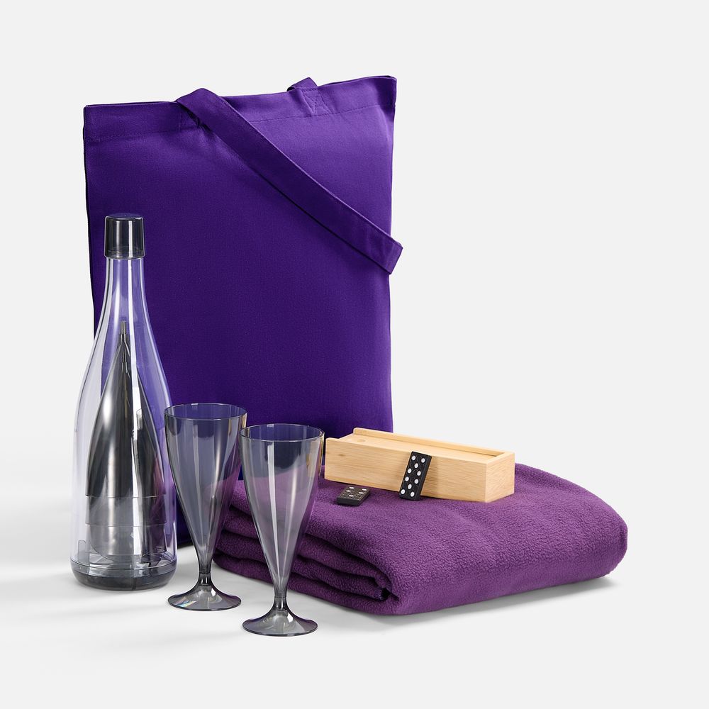 плед — флис, плотность 180 г/м²; набор бокалов — пластик; футляр для домино — бамбук; костяшки — МДФ; сумка — хлопок 100%, плотность 220 г/м²; саржа