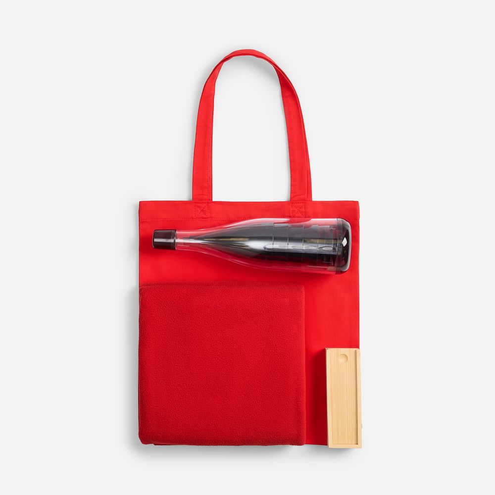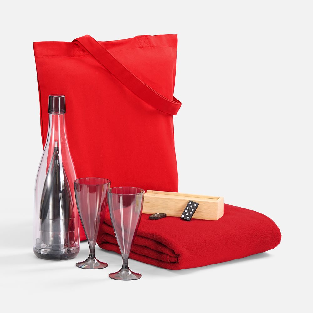 плед — флис, плотность 180 г/м²; набор бокалов — пластик; футляр для домино — бамбук; костяшки — МДФ; сумка — хлопок 100%, плотность 220 г/м²; саржа