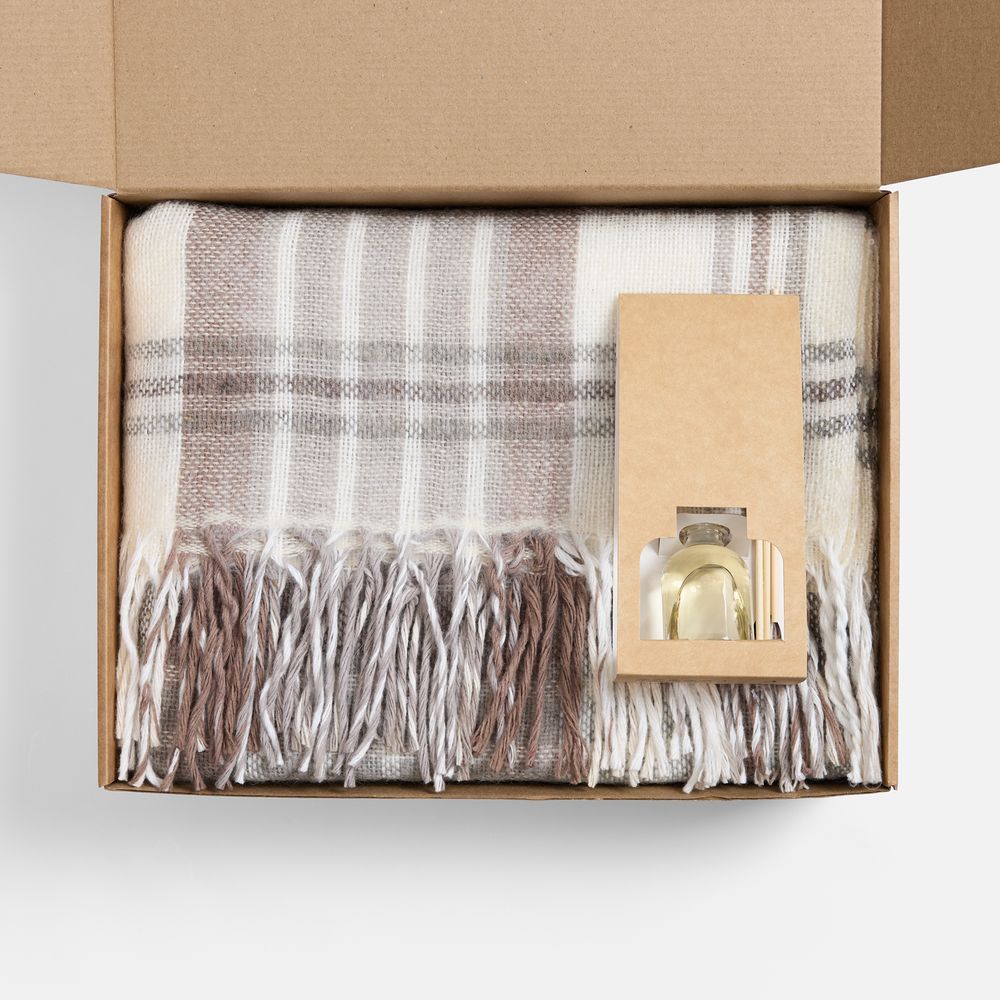 плед — шерсть 50%; полиэстер 30%; акрил 20%; флакон — стекло, палочки — дерево; коробка — микрогофрокартон
