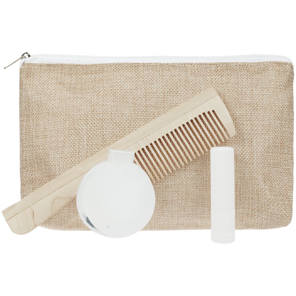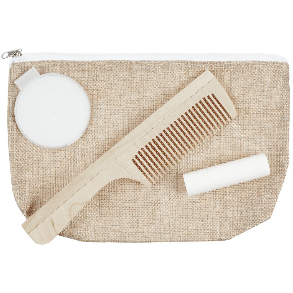помада, зеркало — пластик; расческа — дерево; косметичка — полиэстер