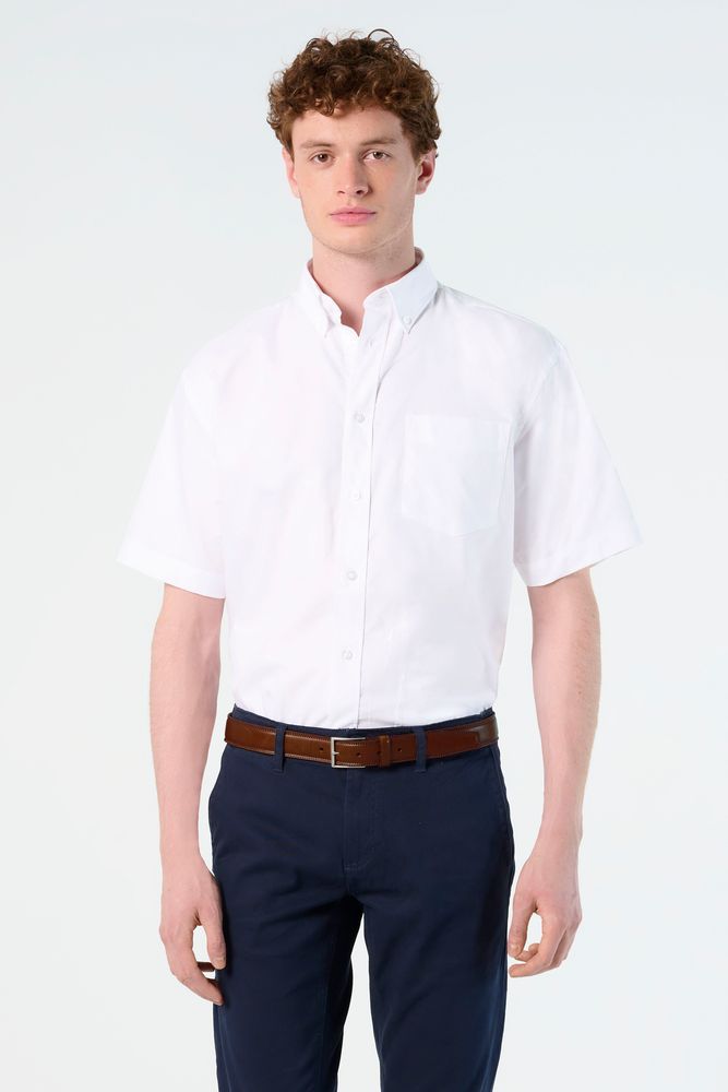 Рубашка из ткани «Оксфорд» с нагрудным карманом слева. На спинке две симметричные складки, воротник на двух пуговицах, регулируемые манжеты, планка с семью пуговицами в тон.