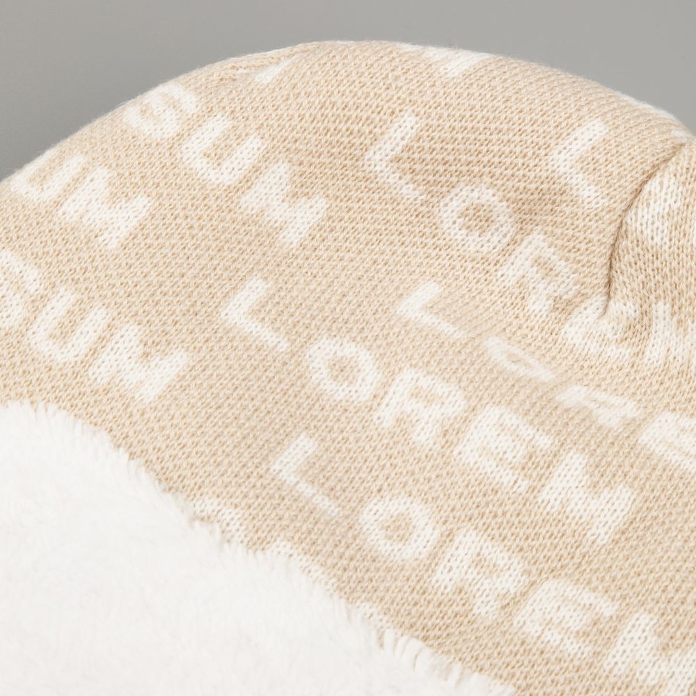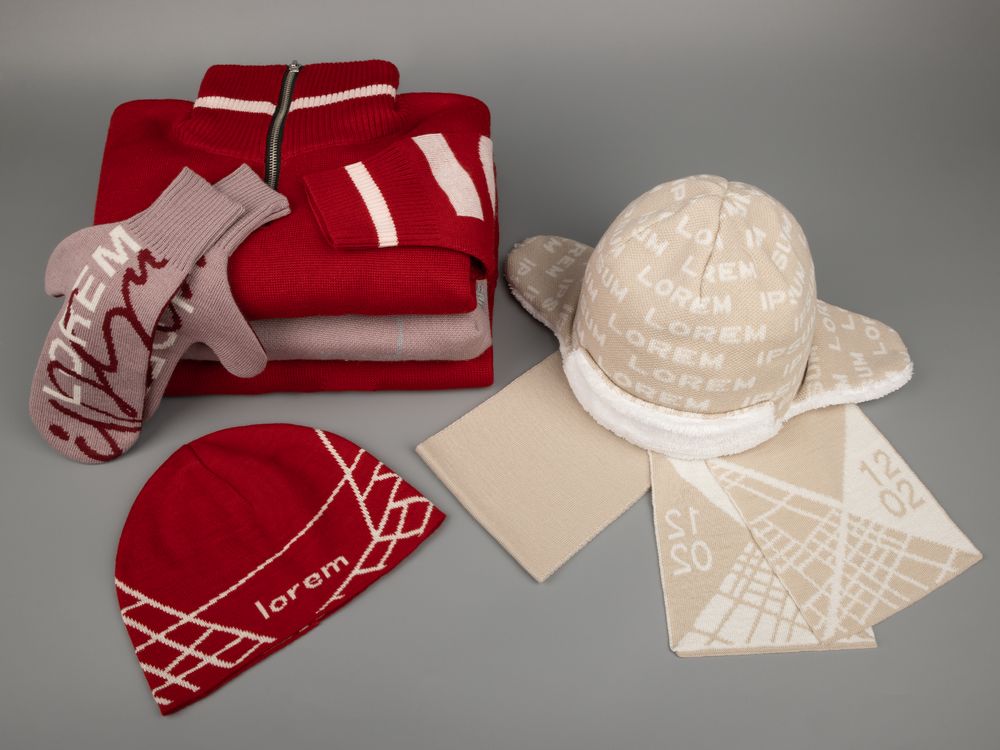Шапка с вывязанным логотипом и индивидуальным рисунком в фирменной цветовой гамме.