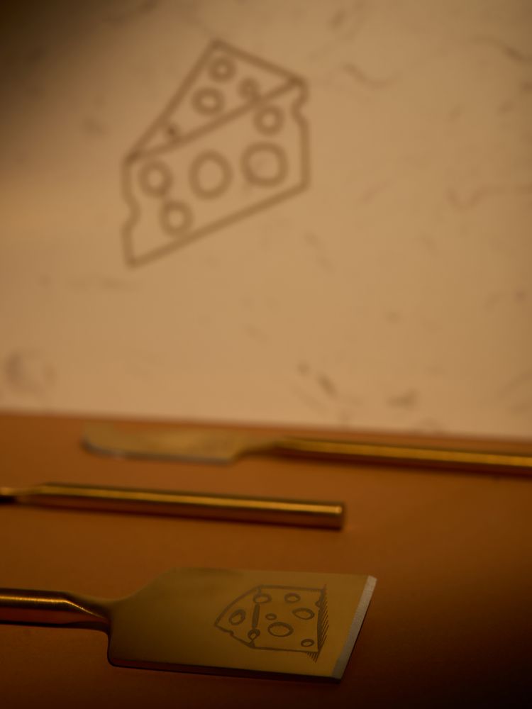 Золотистый цвет ручек и трех ножей подчеркивает статус всего набора и возвышенность самой сырной дегустации. При нарезке мягких сортов сыра особенно важно сохранить эстетичный вид ломтиков, поэтому здесь не обойтись без специальных ножей. Нож-лопатка удобен как для нарезки, так и для сервировки мягких и полутвердых сортов, а еще им можно красиво раскрошить твердый сыр. А нож с раздвоенным кончиком можно также использовать в качестве элегантной вилки. Листовидный нож для твердых сортов — это проверенная классика, которой можно доверить пармезан.