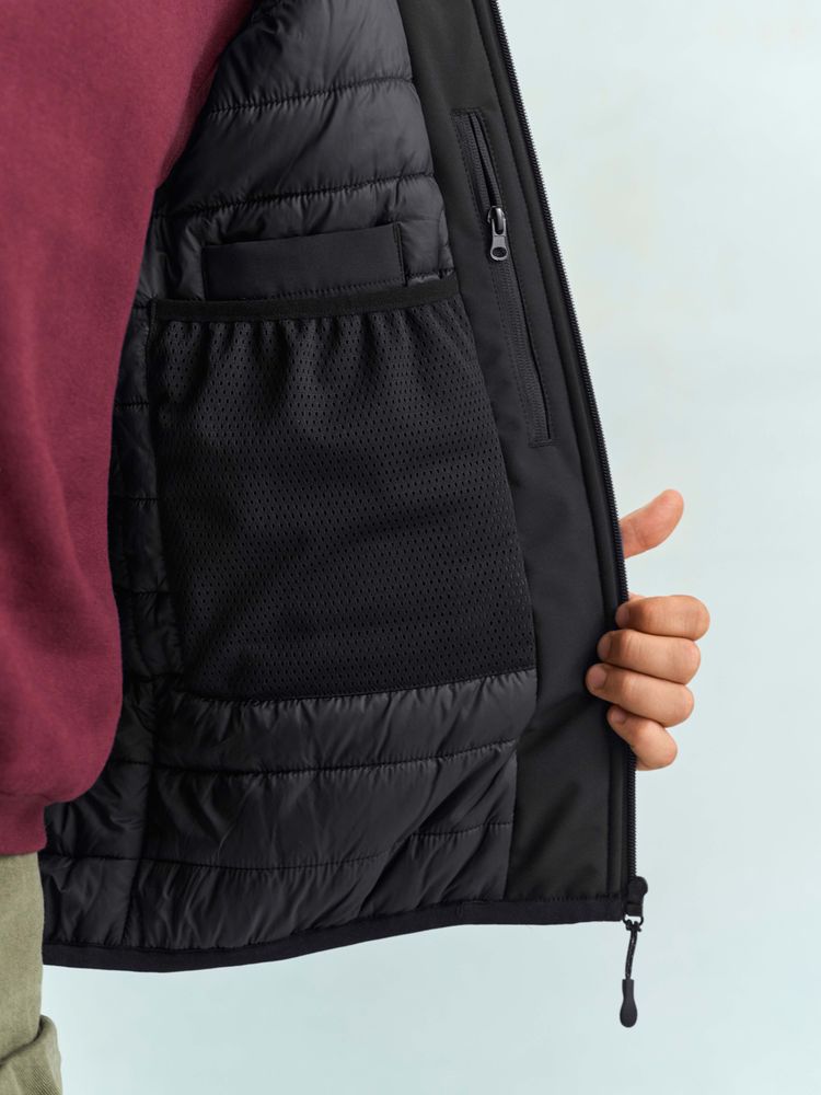 верх — переработанный полиэстер, 94%; эластан 6%, плотность 270 г/м²; софтшелл; подкладка — нейлон 100%; утеплитель — переработанный полиэстер, 100%